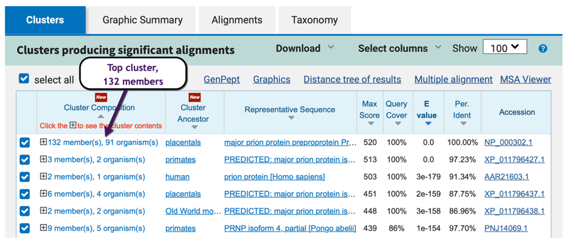 更广的分类覆盖范围:结果中能体现更多物种的多样性信息(某些物种代表性过高,在蛋白质搜索中占据主导地位,例如示例中人类朊蛋白的搜索结果覆盖了132条序列的聚类)。