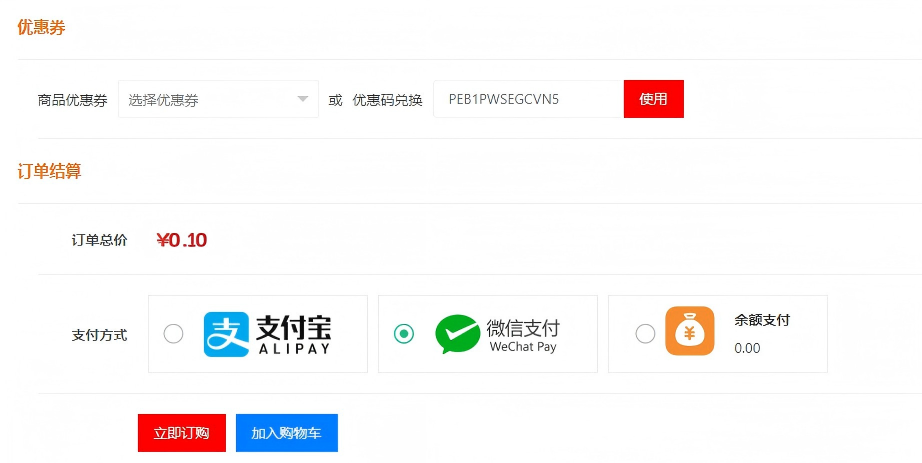 (3)在结算界面“优惠券”栏目中,输入“优惠码”,即可看到已经抵扣费用,最终实付款为原价减去优惠码的抵扣额,本示例中是只需支付0.1元。
