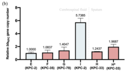 在治疗期间,特别是在感染后期,从同一患者分离的菌株中blaKPC基因的相对表达逐渐增加。患者1的最后一个分离物中blaKPC基因的表达量可能比初始分离物高1.6倍,而患者2的基因表达量甚至可能达到5.7倍。