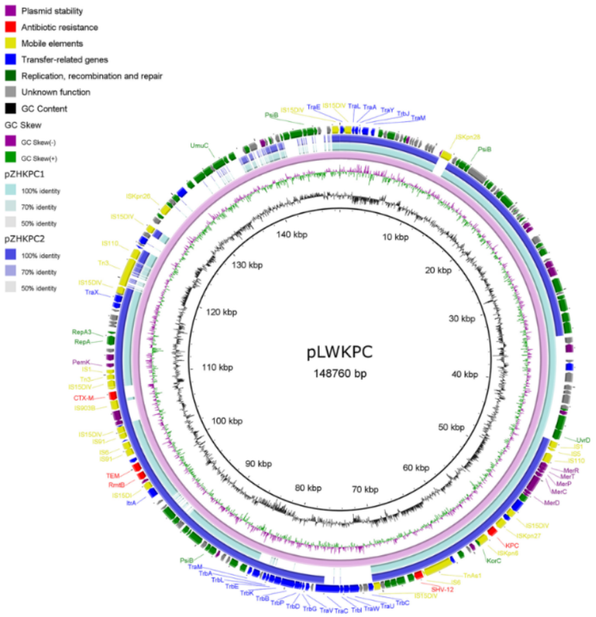 患者1分离的K. pneumoniae A至D,blaKPC位于IncFII/IncR质粒pLWKPC中,其长度为148,760 bp;患者2分离的K. pneumoniae E至I,blaKPC位于IncFII/IncR型质粒pZHKPC1(脑脊液)和IncFII型质粒pZHKPC2(痰)中,长度约为105 kb,与pLWKPC相比,覆盖率为74%,同一性为99.88%。三者都包含两个多药耐药基因岛:①blaKPC和blaSHV-12;②rmtB(、blaCTX-M-65)、blaTEM-1B。耐药基因周围的多种转座子及插入序列预示着抗性基因存在潜在的快速转移能力。