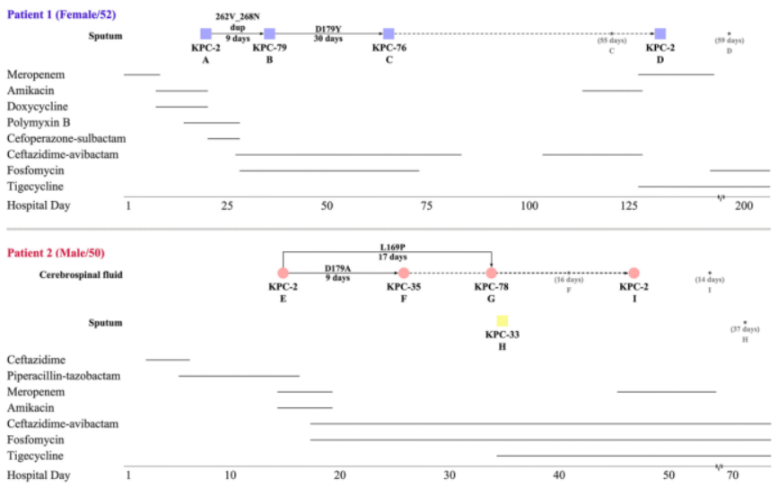 (图1 含有blaKPC-2多种变体的K. pneumoniae感染患者的临床治疗和微生物学特征)