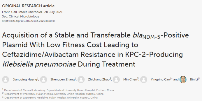 Huang J, Zhang S, Zhao Z, et al. Acquisition of a Stable and Transferable blaNDM-5-Positive Plasmid With Low Fitness Cost Leading to Ceftazidime/Avibactam Resistance in KPC-2-Producing Klebsiella pneumoniae During Treatment [J]. Front Cell Infect Microbiol, 2021, 11: 658070.