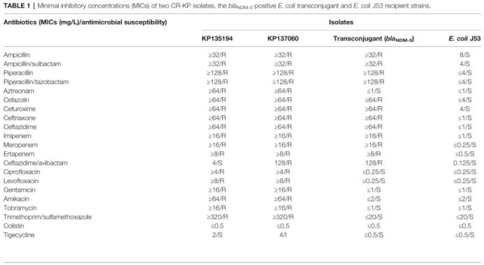 (表1 两株CR-KP分离株和大肠杆菌J53、转接合子的最小抑菌浓度(MIC))