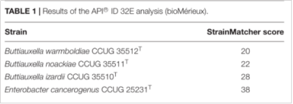 (1)MALDI-TOF分析。鉴定最近的物种是Escherichia vulneris(肠杆菌科),但其相似性也只有74.4%,低于种内阈值90%,无法确定具体种。(2)生化实验鉴定的最近物种为Buttiauxella izardii(肠杆菌科),Enterobacter cancerogenus(肠杆菌科)(table1)。